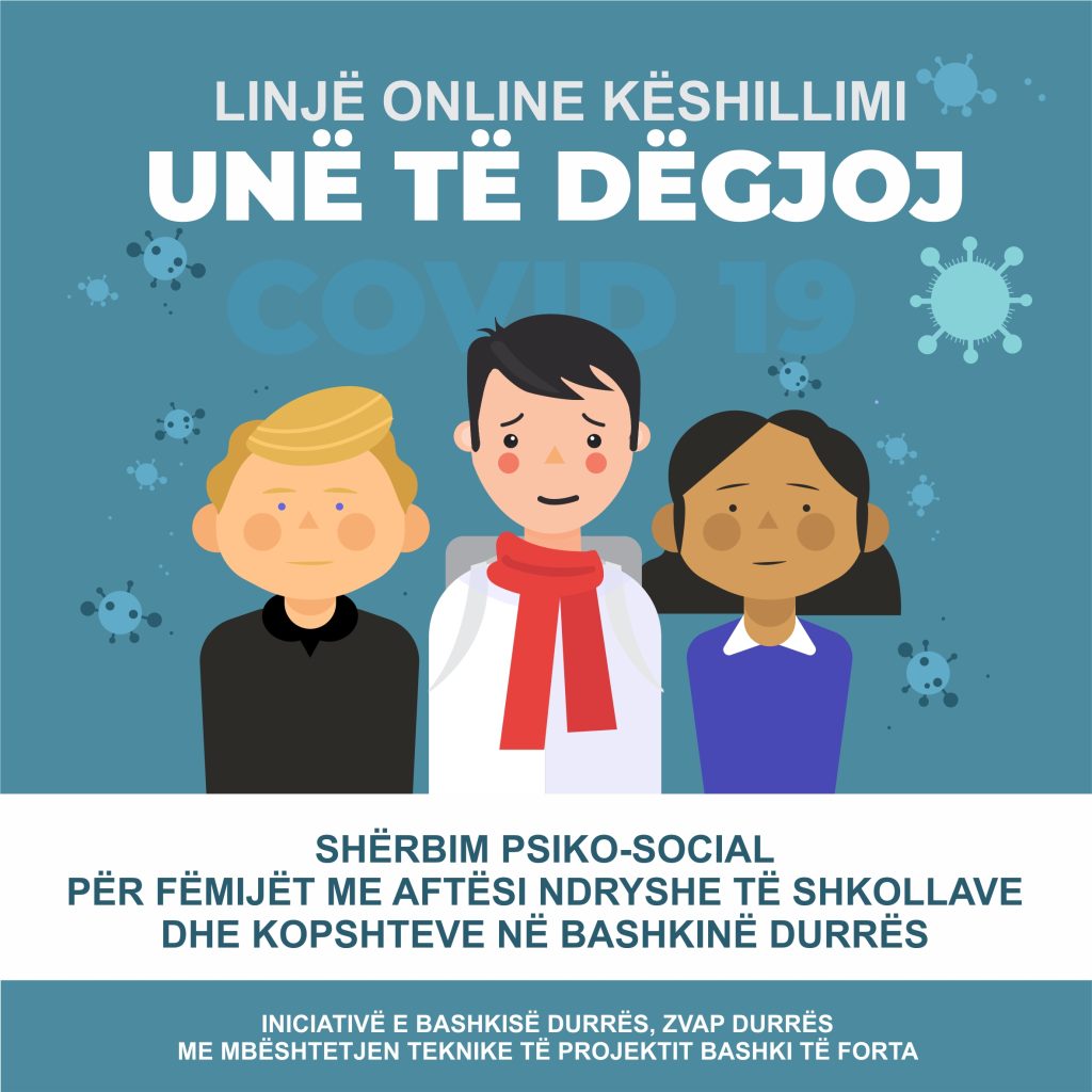 Në kuadër të situatës së krijuar në vend nga përhapja e virusit COVID-19 si dhe masave për të përballuar sa më mirë këtë situatë, Bashkia Durrës dhe Zyra Vendore e Arsimit Parauniversitar Durrës (ZVAP), me mbështetjen teknike të Projektit “Bashki te Forta”, lançojnë linjën e këshillimit online “Unë të dëgjoj”.